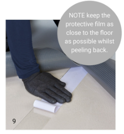 Carefully peel away the protective film from all areas where the tape has been applied. NOTE keep the protective film as close to the floor as possible whilst peeling back.