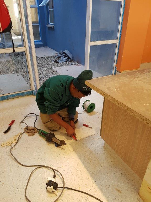I met a young fitter called Theo. Theo is a student who has trained through the FITA NQF level 1 course run at Sparrow Schools. He is currently doing his practical on-site training with Combined Flooring at Kimberley Psychiatric Hospital. He has been trained in vinyl fitting by the team he is working with and now has the skills to fit vinyl sheeting, including coving, grooving and welding. Theo’s lovely comment was, “I love my job so it’s not hard work”. How rewarding to see a young man take this opportunity and put so much effort and enthusiasm into making a success of it. He is creating a bright future for himself. I shall look forward to seeing him become a top fitter.